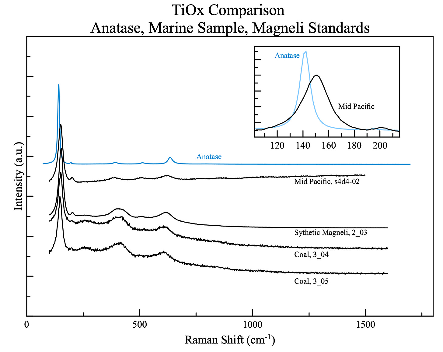 Certain layers contained something in the TiOâ region of the spectrum â peaks in positions that suggested titanium oxide, in a part of the Raman fingerprint where anatase and brookite live. But the peaks didnât match either. They didnât match anything. Not anatase. Not brookite. Not rutile. Not any mineral in the reference database. The barcode didnât scan wrong â it didnât scan at all.