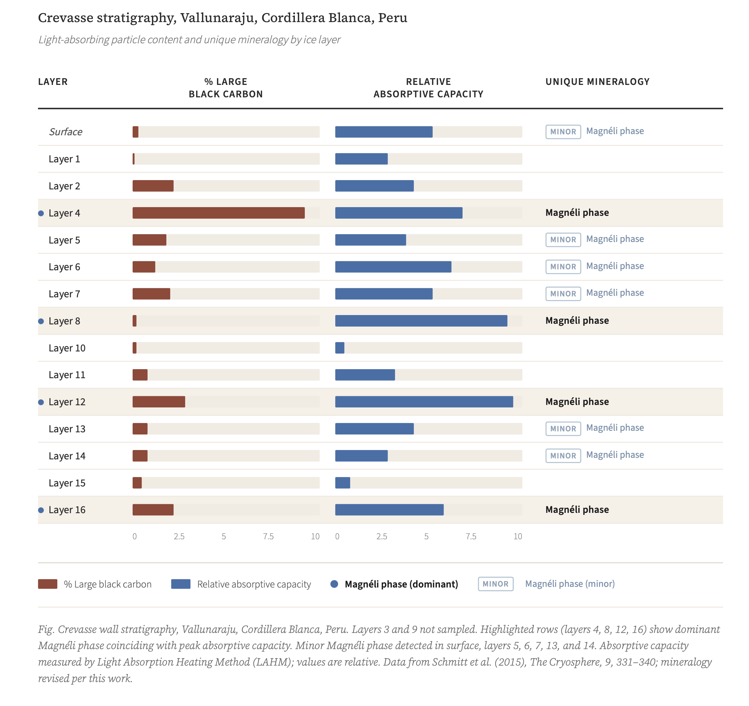 And then thereâs the pattern visible only when the Peru stratigraphy data is laid out in full: the four layers with dramatically elevated light absorption â layers 4, 8, 12, and 16 in the crevasse sequence â fall at perfectly regular intervals. In glacier stratigraphy, regular periodicity usually reflects regular deposition â a recurring atmospheric transport event on a predictable cycle, something that happens on a schedule and leaves a mark in the ice at regular depth. What that schedule is, or what drives it, is not yet known. The pattern is there. The explanation isnât.