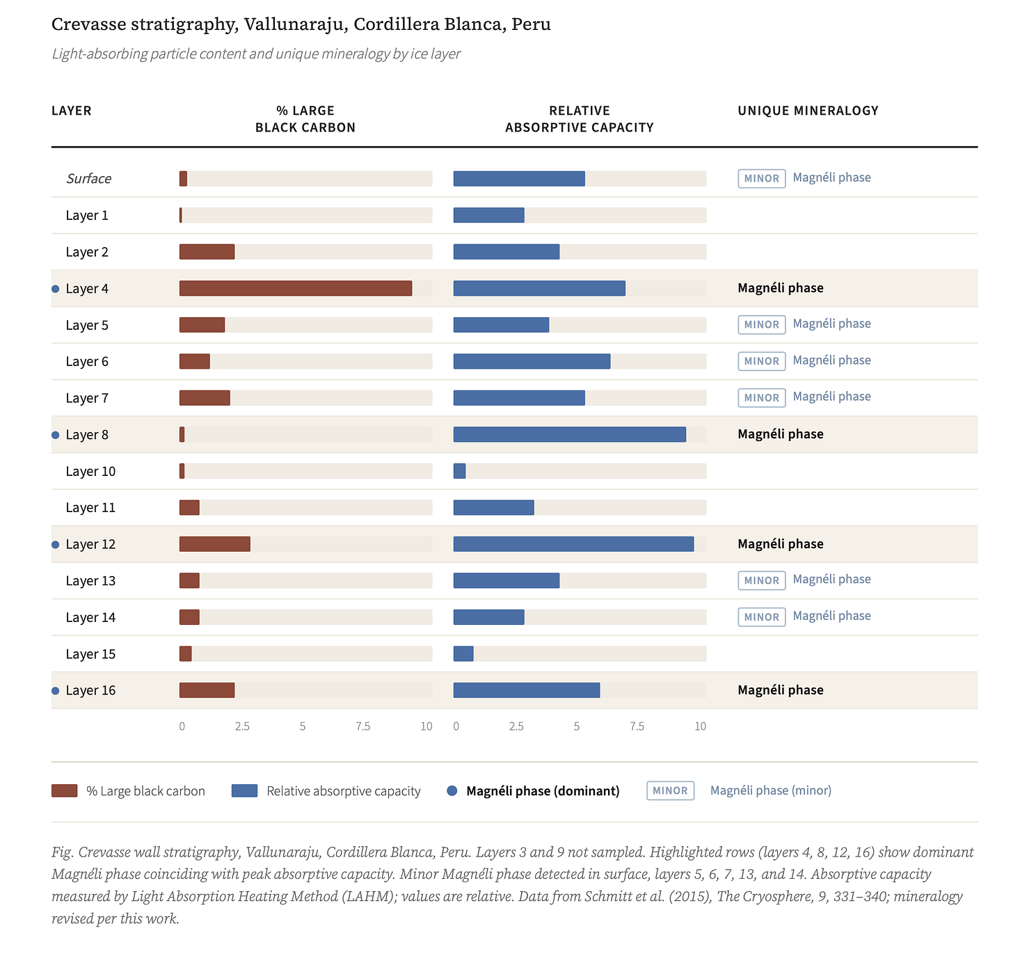 Crevasse stratigraphy and LACM absorptive capacity data are from Schmitt et al. (2015), The Cryosphere, 9, 331â340. MagnĂŠli phase discovery and global distribution estimates from Yang et al. (2017), Nature Communications, 8, 194. Raman calibration from Parker & Siegel (1990), Applied Physics Letters, 57, 943. Aragonite dissolution data from Dong et al. (2019), Earth and Planetary Science Letters, 513, 129â141. Wildland-urban interface fire ash as an additional source of MagnĂŠli phases from Baalousha et al. (2026), Environmental Science & Technology, DOI: 10.1021/acs.est.5c09885.