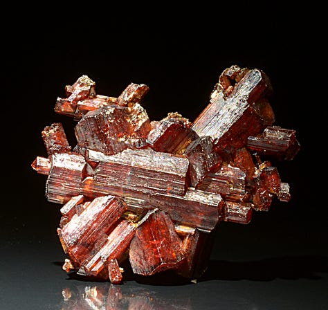 Three specimens, one mineral. The gold twin on hematite. The large silvery-black prismatic crystal from Georgia. The deep red transparent crystals from Minas Gerais. Same chemistry â TiOâ, titanium and oxygen, nothing else â but the color shifts from gold to silver to red depending on trace impurities, crystal size, and the geometry of how light moves through the structure. Collectors love it because it never looks finished. It has the quality of still becoming something.