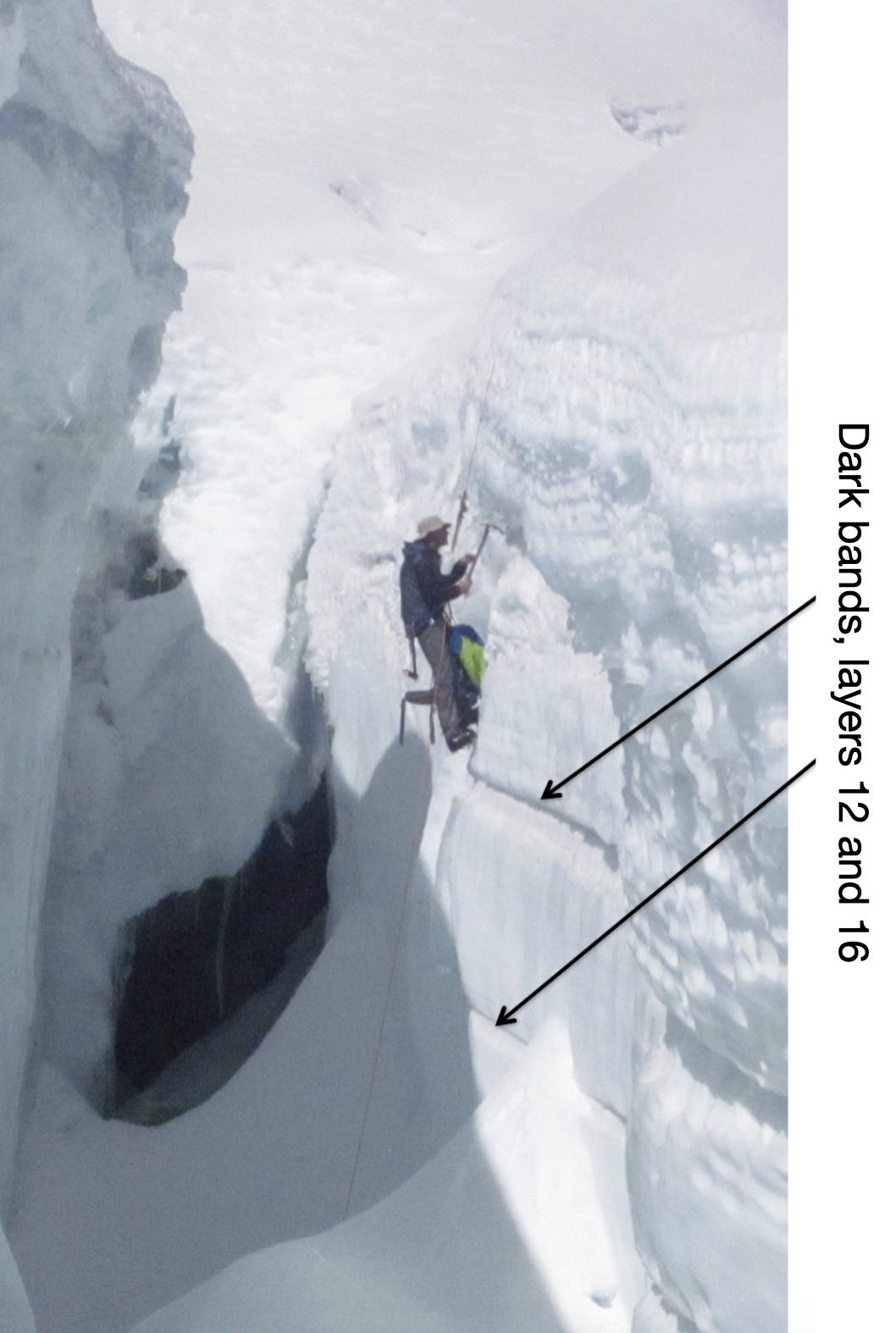 The Peru snow samples came from a specific location: the wall of a crevasse on Vallunaraju mountain â the glaciated peak nearest to Huaraz, the largest city in the region. The crevasse wall showed what glacier walls always show if you look carefully: layers. Dark bands separated by cleaner ice, each band recording a season of accumulation, a year of deposition, a chapter in the mountainâs slow autobiography.