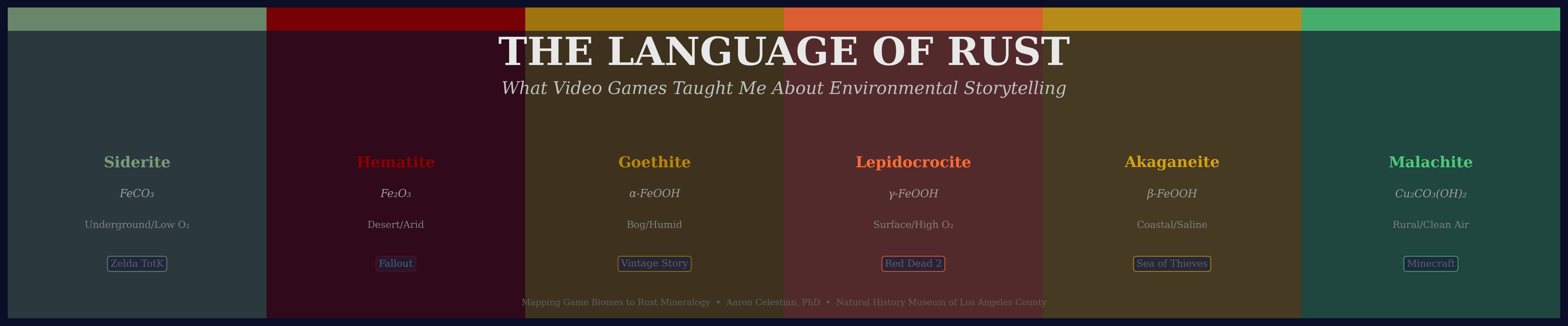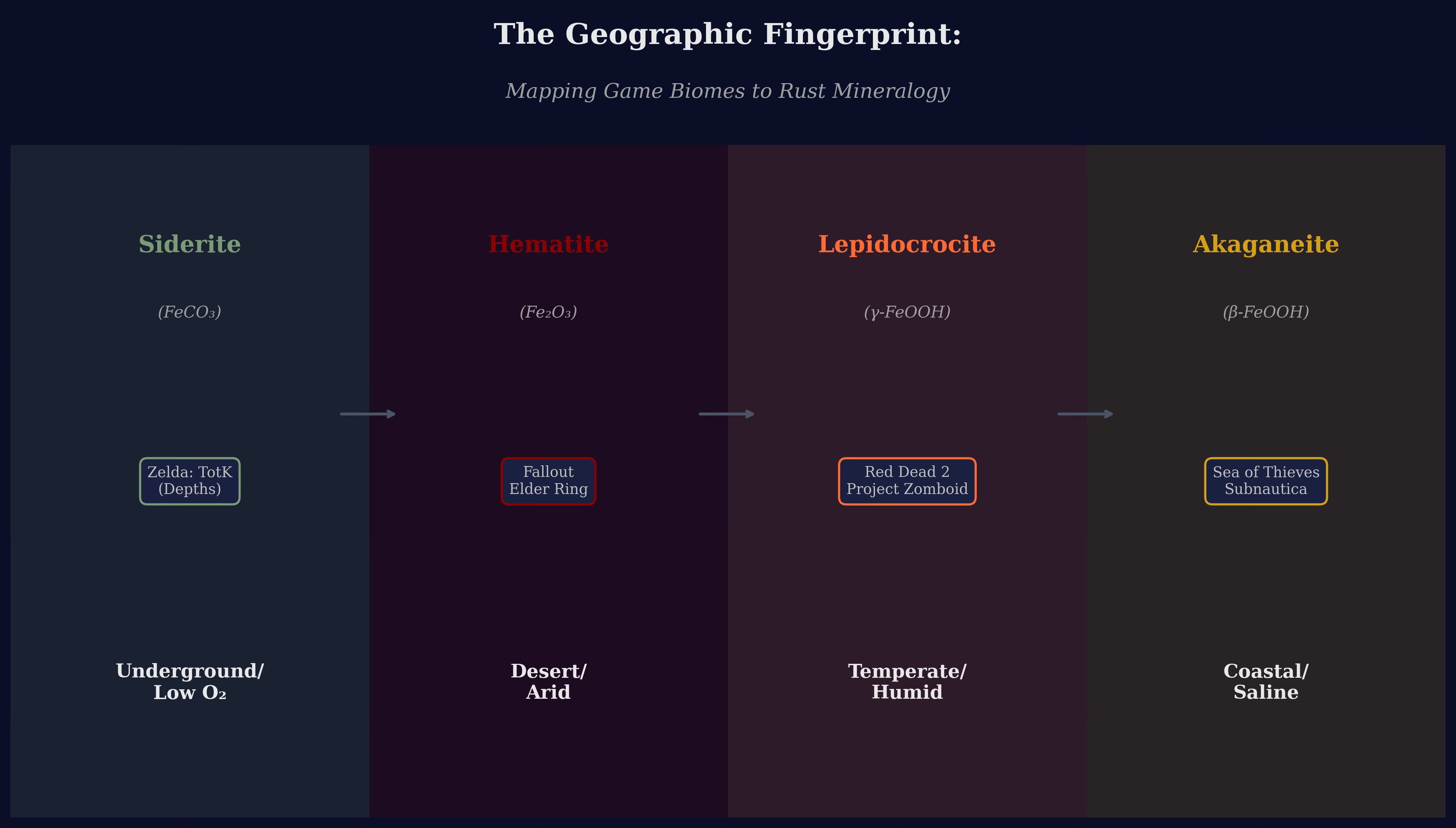 Mapping game biomes to rust mineralogy. Each environment corresponds to specific iron oxide or copper carbonate minerals formed under distinct atmospheric conditions. Game examples show how developers—knowingly or unknowingly—simulate real geochemical processes. Desert biomes favor stable Hematite (Fe₂O₃), while coastal environments produce aggressive Akaganeite (β-FeOOH) with characteristic chloride pitting.