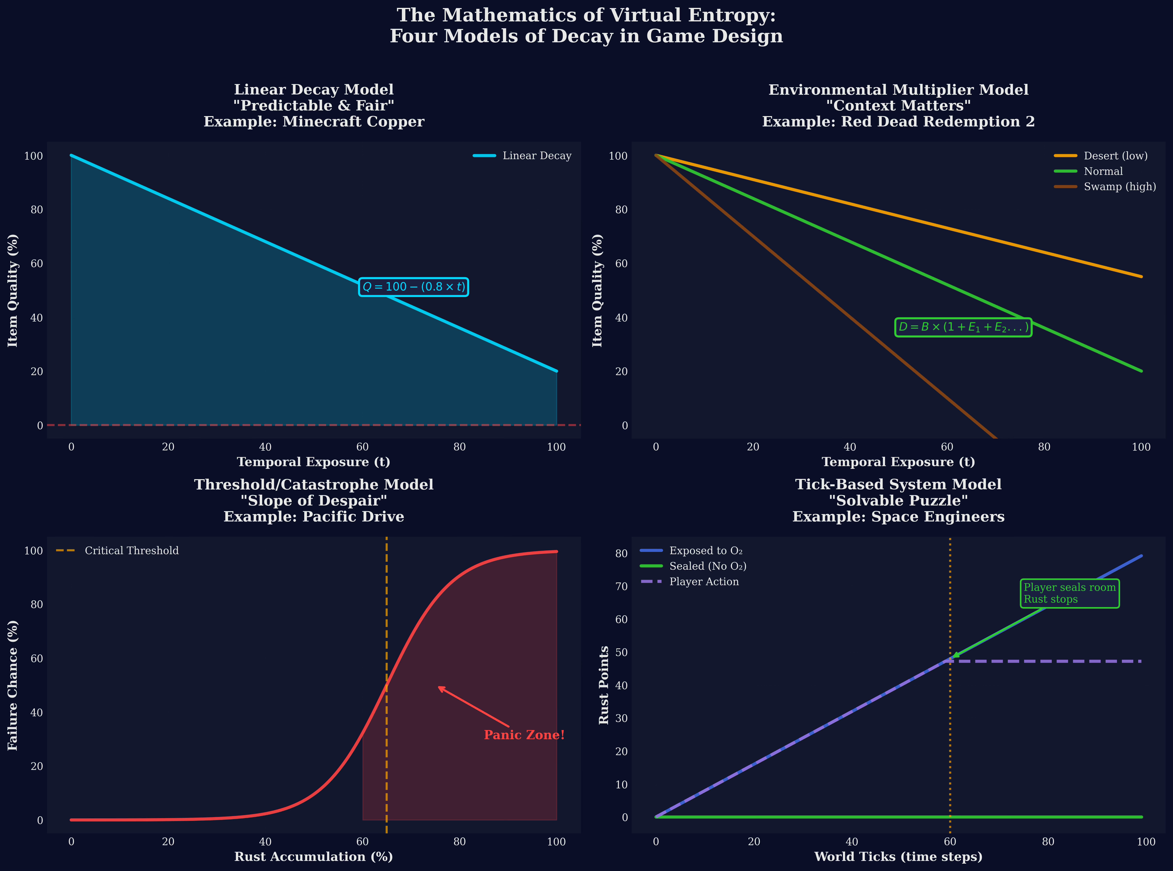 Four distinct mathematical models games use to simulate decay. Linear models (Minecraft) provide predictable aesthetic progression. Environmental multipliers (Red Dead Redemption 2) adjust decay rates based on humidity, rainfall, and immersion—matching real corrosion kinetics. Threshold systems (Pacific Drive) simulate stress corrosion cracking with catastrophic failure. Tick-based models (Space Engineers) treat oxidation as a solvable engineering puzzle where player intervention stops the reaction.