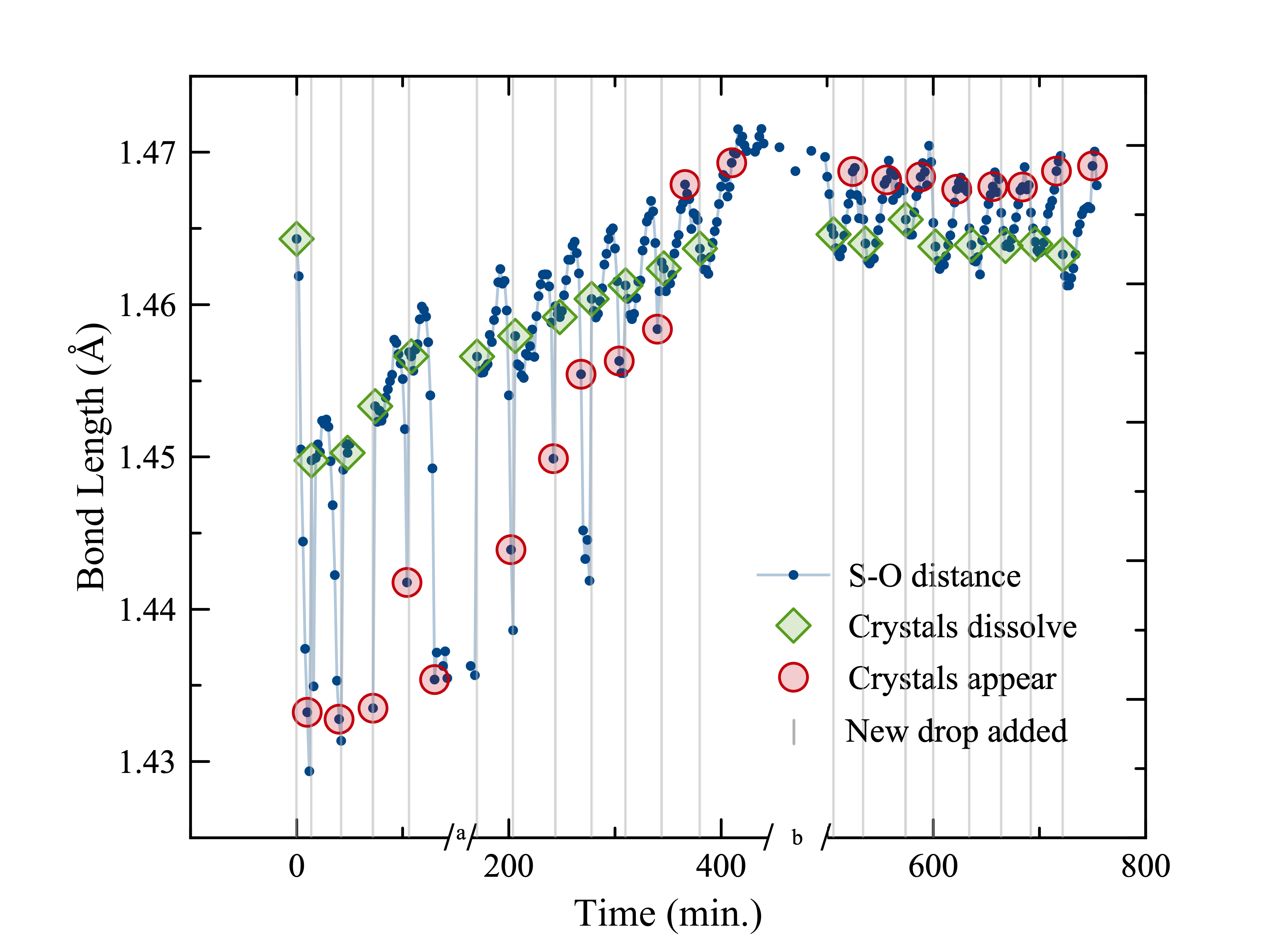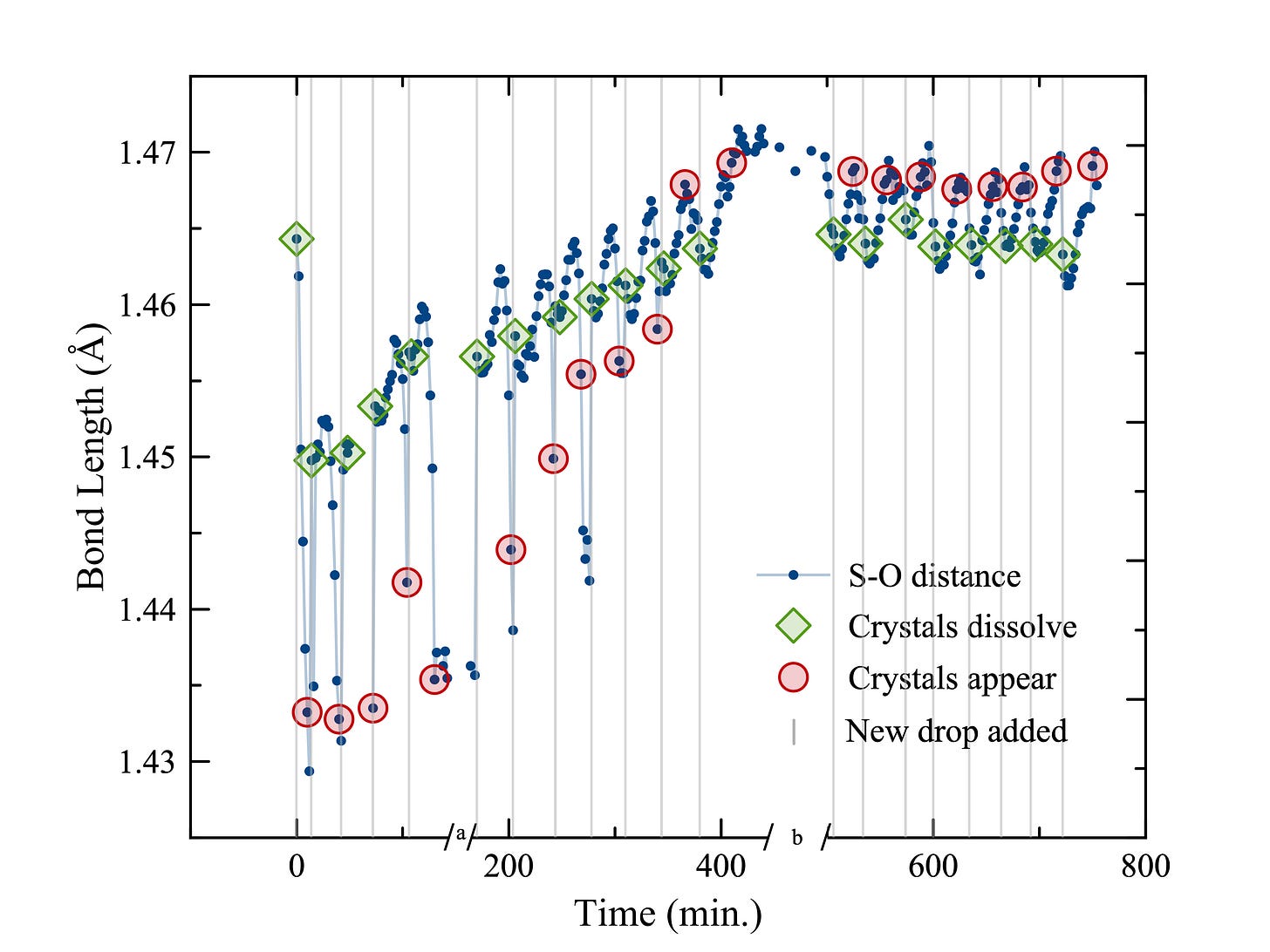 In the first few cycles, when crystals formed, these two peaks were separated by about 5 wavenumbers. A clear spectroscopic fingerprint: âthis is crystalline, not liquid.â