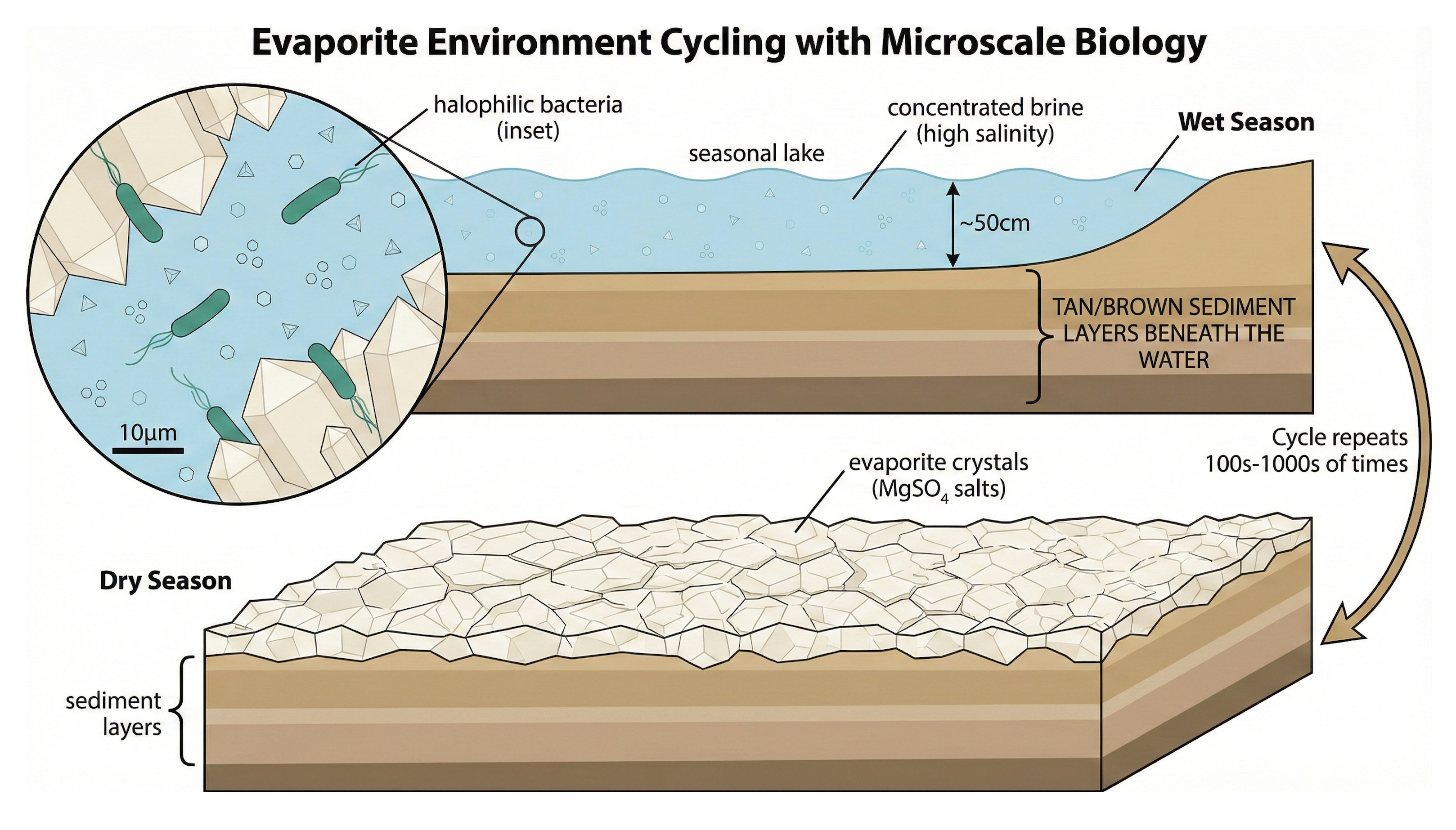 These environments undergo exactly what I did in my experiment: repeated cycles of dissolution and crystallization. Wet season, dry season. Lake, playa, lake, playa. Over and over.