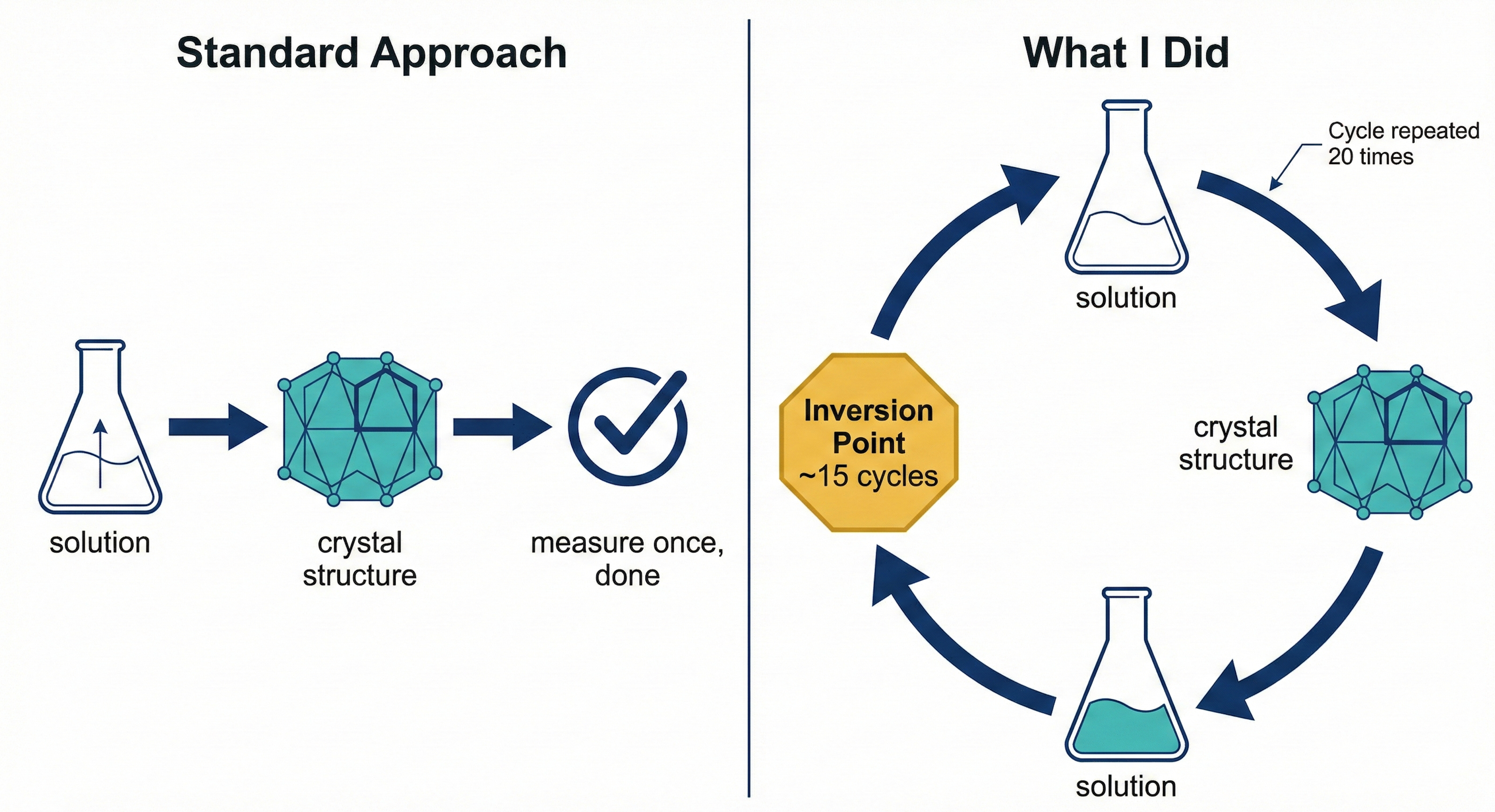 No exotic chemicals. No extreme pressures or temperatures. Just: evaporate, add water, repeat. The kind of thing a kid could do with a salt shaker and a puddle on the kitchen counter, except I had X-rays that could count atoms.