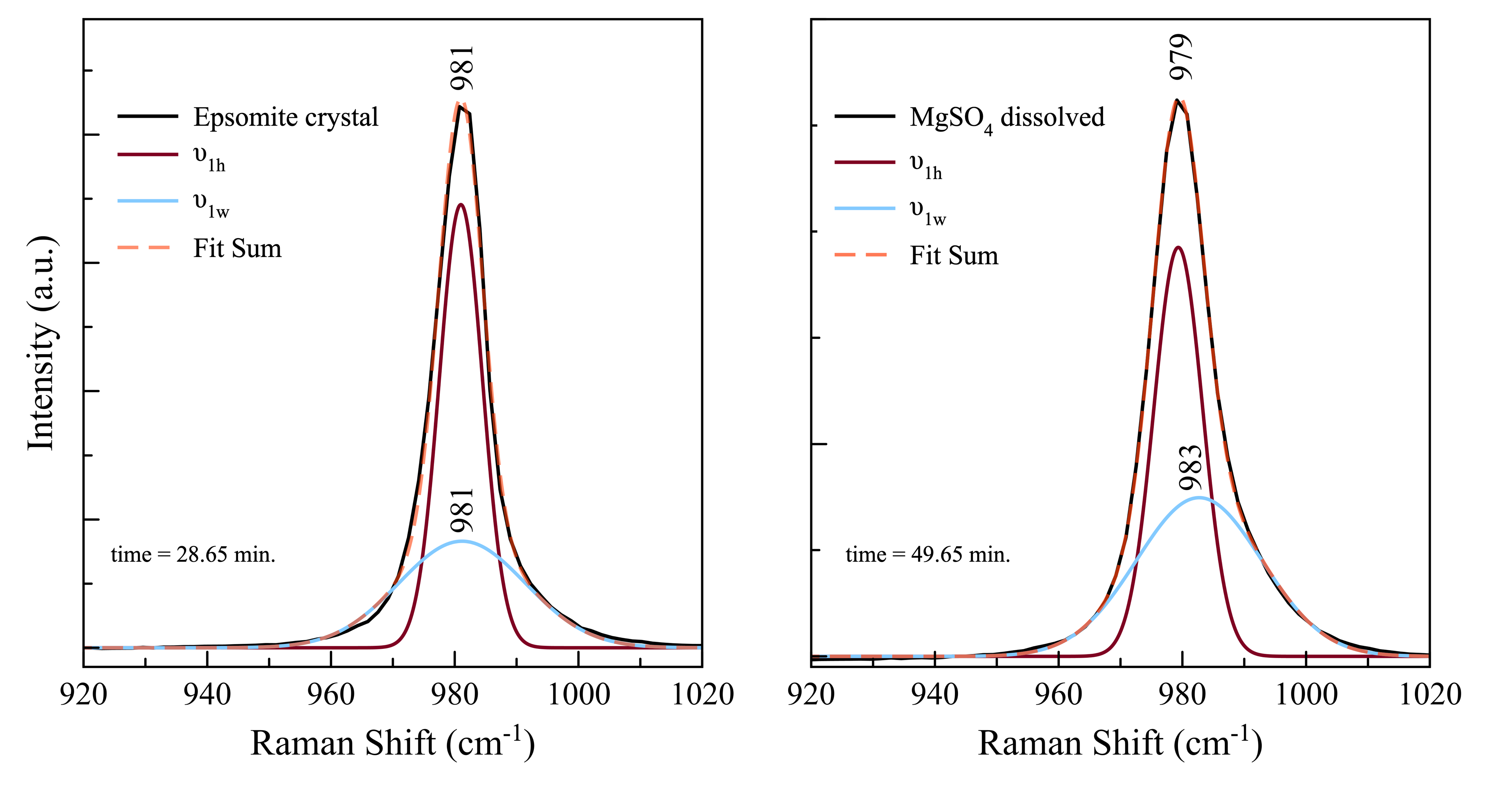I was also running parallel experiments with Raman spectroscopy back in my labâa technique that measures how molecules vibrate. The symmetric stretch vibration of the sulfate group splits into two distinct frequencies when you look closely. Call them Μââ and Μâw, representing sulfate groups in slightly different environments.